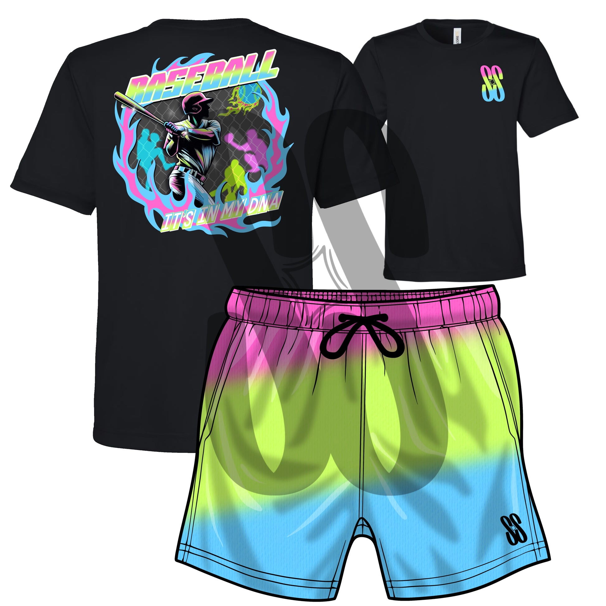 Turn heads before you even step up to the plate. This Neon DNA Baseball Set is built for players who bring power, passion, and personality to the game. Featuring a bold neon flame graphic tee and matching ombré shorts, this set delivers a look that’s explosive, electric, and unmistakably yours.